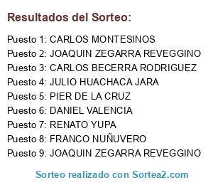 Lista de participantes: JHOSEP POPAYAN(10), JORGE MALLQUI(10), NATALY ALLASI(10), JHORDAN ESPINOZA(6), JHONATAN PARRAGA(5), JOHN DIAZ(5), MARCELO ORIHUELA(5), EDWIN BALTUANO(5), WILSON TORRES FARFAN(5), CARLOS MONTESINOS(5), JOSE SATO YAMADA(5), JOSE LUIS ROZAS(5), EDERSON VALVERDE(5), DIEGO CHAVEZ YALLES(5), ALVARO REYNA(5), CARLOS AQUIÑO(5), GIACOMO REGUELLIN(4), PIERO CARBONEL(4), JOAQUIN ZEGARRA REVEGGINO(4), JOSSYMAR GARCIA(4), WALTER FELIPE(3), PIER DE LA CRUZ(3), AXEL SANCHEZ(3), JEAN CAMARGO(3), ANDRES CARRASCO(3), MARLENY SOTO SOVERO(3), RAFAEL CASTILLO(3), DENNIS VALENTE ARROYO(3), ALIRIO VILLANUEVA(3), KENNETH WILSON ROZAS(3), ALDO ESPINAL MEZA(3), JUNIOR LOPEZ SILVESTRE(3), ANIBAL SILVA(3), SANTIAGO ALONSO VILLANUEVA ORTEGA(2), SOLIN PUMA(2), JOSE REYES ALARCON(2), GABRIEL JIMENEZ(2), FRANCO NUÑUVERO(2), JUAN CARLOS PERREX(2), JOSE ANDRES SCHULLER KOCH(2), GONZALO TRIVEÑO(2), ERIC JARA(2), CARMEN NAPURI(2), DIEGO RIOS CACERES(2), ODALIS FIESTAS LLATAS(2), DANIEL VEGA DE LA CRUZ(2), RENZO DE LA CRUZ AQUIJE(2), PAULO VALDIVIEZO(2), CARLOS PORTOCARRERO(2), CARLOS BECERRA RODRIGUEZ(2), ANDRES PEREZ-ALBELA(2), ALEXANDER JOEL PRADA LICLA(2), SOLEDAD FIESTAS(2), ROBERTO PAREDES HUGO(2), DIEGO VALENZUELA MEDINA(2), ALVARO CARRION CADILLO(2), ALONSO CHECA BRAGA(2), VICTOR ZUÑIGA LARCO(2), RENATO YUPA(2), PEDRO ALONSO FLORES(2), KATHERYN GUEVARA TELLO(2), JOEL ALFARO LOYOLA(2), DIEGO SAAVEDRA VALIENTE(2), ALFONSO ALVITES(2), ALEJANDRO TORRES(2), DANIEL VALENCIA(1), RENATO ESPINOZA(1), FERNANDO MIGUEL CHACPE(1), ALBERT VILLANUEVA(1), ERIK FIERRO ARCE(1), JOSE MOSCOSO(1), FERNANDO PAREDES(1), DANIEL OSORIO MARTINEZ(1), PEDRO PIZARRO RUIZ(1), OSCAR SOCUALAYA(1), MANUEL AYLLON(1), MANUEL CHAVEZ(1), EDGAR MOLINA(1), CARLOS SAAVEDRA(1), CARLOS LOZA ESQUIVEL(1), EDUARDO CHAMORRO ATALAYA(1), ANDEA DEPAZ(1), WILLIAM ESPINOZA ADARMES(1), VICTORIA SOLIS PEÑA(1), VICTOR PAREDES(1), VICTOR ESPINOZA SANCHEZ(1), LUIS MECHAN(1), LISBETH ROQUE(1), HANS GONZALES PRECIADO(1), FREDDY FLORES(1), DENNIS ANTONIO GAMBOA(1), ARTURO BARRANTES(1), ALE FARIAS TAPIA(1), YASSER IPARRAGUIRRE CIEZA(1), WALTER BAZO COTOS(1), VANE HUARANGA(1), RUBEN BALDEON VILLEGAS(1), NIXSON RAMOS DIAS(1), MELISSA RAFAEL BRINGAS(1), KATHERIN BOUDRY(1), JULIO HUACHACA JARA(1), JOSE LUIS GONZALES JURADO(1), HERBERT VERA(1), HELEN QUISPE(1), GEANFRANCO GUTIERREZ RIVERA(1), FELIX ALEJANDRO SOTELO BERROSPI(1), ERIK CASTRO(1), ELMER SUSANIBAR(1), ELMER CAMAZCA(1), CHRISTOPHER IZAGUIRRE CEVALLOS(1), CARLOS SOLIS(1), CARLOS CABEZAS(1), ANDRE MONTOYA(1), ALEXANDER JANAMPA(1), ALEX MOLINARI GAVIDIA(1), VICTOR SOLIS PEÑA(1), JOSE SOTO PATIÑO(1), CARLOS VASQUEZ POVEA(1), RENZO BAZAN VIZCARRA(1).