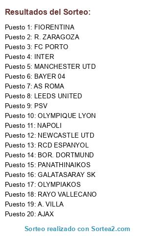 Lista de participantes: A. VILLA, AJAX, AS ROMA, BAYER 04, BOR. DORTMUND, FC PORTO, FIORENTINA, GALATASARAY SK, INTER, LEEDS UNITED, MANCHESTER UTD, NAPOLI, NEWCASTLE UTD, OLYMPIAKOS, OLYMPIQUE LYON, PANATHINAIKOS, PSV, R. ZARAGOZA, RAYO VALLECANO, RCD ESPANYOL.