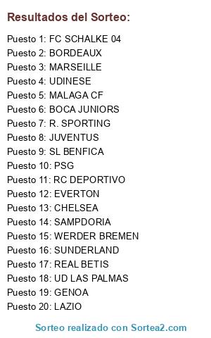Lista de participantes: BOCA JUNIORS, BORDEAUX, CHELSEA, EVERTON, FC SCHALKE 04, GENOA, JUVENTUS, LAZIO, MALAGA CF, MARSEILLE, PSG, R. SPORTING, RC DEPORTIVO, REAL BETIS, SAMPDORIA, SL BENFICA, SUNDERLAND, UD LAS PALMAS, UDINESE, WERDER BREMEN.