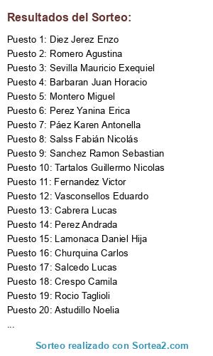 Lista de participantes: ABAN CARLOS ALBERO, ACUÑA CAMILA, AGOSTINUCCI RICARDO, AGOSTINUCCI RICARDO HIJA, AGÜERO PABLO DANIEL, AGUIRRE CESAR, AGUIRRE CLAUDIO, AGUIRRE DANIEL 35194211, AGUIRRE FRANCO DAVID, AGUIRRE JORGE LUIS, AGUIRRE MARTIN, AGUIRRE MAURICIO, AGUIRRE SEBASTIAN 39005567, AIBAR ARNALDO ARIEL, AIGA CONDE MARIA NOEL, AJALLA ALEJANDRO 29494411, AJALLA LEANDRO JORGE 35106734, ALARCON FABIAN MORENA MARTINA, ALARCON FERNANDO FEDERICO, ALBARRACIN EZEQUIEL 42379770, ALBARRACIN RODRIGO, ALBORNOZ JORGE VICTOR, ALBORNOZ LUCIANA 43137500, ALCOBA PABLO DANIEL, ALDANA FEDERICO GASTON, ALEMAN DOMINGUEZ MARCOS, ALIBERTI MARCOS SEBASTIAN, ALIBERTI TIZIANO, ALVARADO GRACIELA, ALVARADO LUCAS, AMADO NAHIR EMILCE 42813333, AMADO SOFIA 57868798, AMADOR GUADALUPE, ANACHURI ADEMAR 92534196, ANGULO ADRIAN 41940280, APARICIO GABRIEL ALEJANDRO, APARICIO MAXIMILIANO, APAZA SEBASTIAN, AQUINO BENJAMIN, AQUINO CARLOS-BENJAMIN 31853684, AQUINO CAVALLI MARIA CECILIA 24453853, ARAMAYO ANTONIANO FELIPE, ARAMAYO BAUTISTA DANIEL, ARAMAYO CANDELA 45114497, ARAMAYO CARLOS 31228196, ARAMAYO CARLOS ROLANDO, ARAMAYO CRISTIAN LEONEL 42815510, ARAMAYO EDUARDO DARIO 30186340, ARAMAYO LUCIANA 43762038, ARAMAYO MAURO IVAN 32044951, ARAMAYO PABLO, ARANCIBIA BIANCA LUCERO, ARANCIBIA CRISTIAN, ARANCIBIA MARCOS JESUS, ARCE DEBORA 31193003, ARCE GONZALO RENE, AREPIA MANUEL, AREQUIPA LORENA CINTIA, ARIAS ANICETO ANTONIO, ARIAS BRIAN HUGO ANDRES, ARIAS BRUNO 35178295, ARIAS DIEGO MAURICIO 36805037, ARIAS FACUNDO, ARIAS FERNANDO 34066379, ARIAS JUAN MAXIMILIANO 38652013, ARIAS MAGNOLIA 38645550, ARIAS MARCELO 45849331, ARJONA DARIO, ARREDONDO ELENA DE LOS ANGELES, ARROYO FACUNDO, ARROYO MARIA JULIA 30099452, ARTAZA VERONICA ESTEFANIA, ARTIGAS NAHUEL, ATENCIO MARTIN, AVALOS DANIEL, AVALOS GUSTAVO 22760230, AVILA DAVID 33046327, AVILA JOSUE, AVILA MARIA 43687503, AYLAN FLORENCIA 39400351, BACCON FERNANDO, BACCON LEONEL 42897161, BAEZ LUCAS EMANUEL, BALCAZAR PABLO EZEQUIEL 35281949, BALDERRAMA DIEGO RICARDO 32510066, BALLON MAURO, BARRERA GONZALO ABEL, BARRIENTOS DANIELA 36128614, BARRIONUEVO ABEL ALEJANDRO, BARRIONUEVO BRIAN, BARRIONUEVO RAMON, BARROS ERICA MARIEL, BARROS RUBEN DARIO, BATRUNI LAUTARO GABRIEL, BAUTISTA CLAUDIO DANIEL, BAUTISTA LEONEL 44017208, BENANE ANAHI BELEN, BENITEZ JOSE LUIS, BENITEZ SANTIAGO 40467180, BERRUETA MACIO ARIEL, BLANCO SERGIO NOEL, BLAS JUAREZ WALTER OSCAR, BLASCO CESAR, BOGGIO ALBERTO, BORDON VICTOR AGUSTIN, BRAVO NICOLAS DARIO, BRUNO JONATAN EMANUEL, BURGOS JAIRO IVAN, BUSSOLARI NAHUEL 44780450, BUSTAMANTE JOHANA DAIANA, CABRERA CESAR IGNACIO, CABRERA LUCAS, CACHAGUA RUBEN HERNAN, CACHAMBI RAMIRO, CALAMARO ARIEL 17381866, CALAMARO EMANUEL 35477863, CALISAYA IGNACIO 39399402, CALPANCHAY SEBASTIAN 38344662, CAMACHO NAHUEL DARIO, CAMPERO VICTOR 29293445, CAMPO FERNANDO SEBASTIAN, CAMPO LUIS MATIAS ALEJANDRO, CAMPOS FERNANDO ANTONIO, CAMPOS MAURO FACUNDO, CAÑIZAREZ PABLO 32347816, CARDENAS GERMAN 33959501, CARDOZO LUCAS PABLO, CARDOZO LUIS FEDERICO 41053015, CARDOZO MARIO 23318734, CARDOZO MAURICIO ALEXANDRO, CARDOZO NOELIA ROMINA, CARLOS DELGADO 25801074, CARPIO FRANCISCO 35264082, CARRASCO MARCELO RUBEN, CARRASCO RICARDO, CARRIZO JOSE, CASIMIRO ESTABAN, CASTELLI JOSE ANTONIO, CASTILLO ANTONIO, CASTILLO GUILLERMO 25369021, CASTILLO LUZ CAMILA, CASTILLO MATIAS, CASTILLO OSCAR, CASTILLO ROBERTO, CASTILLO TOMAS, CASTRO DIEGO, CATACATA CARLOS MATIAS, CATACATA IVO LIONEL, CAYAPUYO EZEQUIEL, CAYO FERNANDO 36280044, CAYO LUIS, CAYO ROCIO FLORENCIA, CAYOPUYO DEBORA, CAYOPUYO MIGUEL, CEPULBELDA GASTON EZEQUIEL 39006191, CHACHAGUA RUBEN, CHAILE FRANCISCO, CHAVARRIA RUBEN, CHAVEZ ERNESTO HORACIO, CHECA SILVIA ESTHER, CHIBAN ZAMAR MARTIN, CHILO ROSA AURELIA 21634918, CHIOZZI MARIO 16658953, CHIOZZI OSCAR MATIAS, CHIOZZI ROBERTO RICARDO, CHOQUE LUIS RICARDO, CHOQUE THIAGO NAHUEL, CHOQUE TIAGO, CHOQUIVILCA NICOLAS 35935324, CHUCHUY JIMENA MERCEDES, CHUCHUY SANCHEZ LUCIANA TAMARA, CHUQUISACA CRISTIAN DANIEL, CIL CARLOS RAUL, CLEMENTE MARIANO, CLEMENTE NOELIA ROMINA 32365236, COLLAR ENZO 35048616, COLLAR JUAN MARCELO, COLQUE AYELEN DEL MILAGRO, CONDORI CARLOS 41908202, COPA GUILLERMO, COPA PAULA, COPA SOFIA, CORDOBA ADRIAN GUSTAVO, CORDOBA FEDERICO, CORDOBA MATIAS, CORDOBA MIGUEL 31045645, CORDOVA MATIAS, CORIA REINA MIA JIMENA, CORIA SOL YANINA, CORIMAYO LUCAS NICOLAS, CORONA NICOLAS 34066003, CORONEL EMILIANO HERNAN, CORONEL FACUNDO 40149087, CORREA CARLOS FEDERICO 29335357, CORTEZ EMANUEL, CORTEZ FACUNDO NICOLAS, CORTEZ SANGUINO GUSTAVO EMANUEL, CORTEZ SANGUINO PAOLA 38340032, CRUZ ALEX RICARDO, CRUZ ESTEBAN MAXIMILIANO, CRUZ HECTOR JOSE, CRUZ LUCAS, CRUZ MARCELO, CRUZ PABLO SIMON, CRUZ RAFAEL, CRUZ RAFAEL (PF), CURKOVIC BARBITO CAROL ALEJANDRA, DAHER MATIAS FEDERICO, DE LA ROSA ELIO, DE LA ROSA GUSTAVO ADOLFO, DE LA VEGA AUZA LUIS M, DE LA VEGA LUIS, DE LA VEGA LUIS MARIA, DE LA VEGA MARIA EUGENIA, DELGADO CARLOS, DELGADO JAZMIN 52344958, DELGADO JOSE 29335794, DELGADO LAURA, DELGADO LUCAS, DELGADO MARIA IGNACIA, DELGADO SARA, DELGADO VICTOR ALEJANDRO 45598960, DI SALVO ENZO FERNANDO, DIAZ CARINA NOEMI, DIAZ CARLOS 29008548, DIAZ DAVID IVAN, DIAZ FERNANDO MARTIN, DIAZ FRANCO IVAN, DIAZ HECTOR 28251120, DIAZ JOSE 45019702, DIAZ JOSE ROBERTO, DIAZ JUAREZ 37720771, DIAZ MORA 55642807, DIAZ NICOLAS 39361566, DIAZ OSCAR ALBERTO, DIEZ HELGUERA JOSE ANTONIO 39215284, DIEZ ZAVALETA JOSE ANTONIO, DOMINGO PABLO 32805353, DOMINGO RICARDO 12553630, DOMINGUEZ LEONOR, DURAN FERNANDO DANIEL, ESPINOZA CINTIA GEORGINA 36805436, FABIAN JOAQUIN, FABIAN JUAN PABLO 30015577, FABIAN NICOLAS, FELIPE PERELLO 53713888, FELIX ALMAZAN, FERANDEZ RUBEN, FERNANDEZ AARON VALENTINO, FERNANDEZ AGUSTIN NICOLAS, FERNANDEZ JORGE EMANUEL, FERNANDEZ NOELIA FLORENCIA, FERNANDEZ NOELIA NATALIA, FERNANDEZ RAUL ALBERTO, FERNANDEZ VICTOR ANTONIO, FERREIRA BLAS ADRIAN, FIGUEROA AGUSTINA 42079679, FIGUEROA JOSE, FIGUEROA MASUD FACUNDO 34076458, FLORES CARLOS EDUARDO (PF), FLORES FACUNDO, FLORES JONATHAN 42814047, FLORES JUAN FEDERICO, FLORES NOELIA M