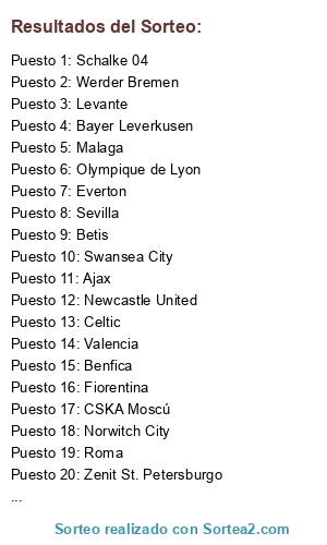 Lista de participantes: Malaga, Valencia, Sevilla, Betis, Levante, Bayer Leverkusen, Schalke 04, Werder Bremen, Ajax, PSV, Monthpelier, Olympique de Lyon, Swansea City, Norwitch City, Newcastle United, Everton, Lazio, Fiorentina, Roma, Oporto, Benfica, Celtic, CSKA Moscú, Zenit St. Petersburgo.