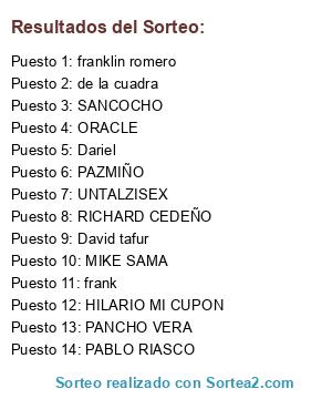 Lista de participantes: Dariel, David tafur, de la cuadra, frank, franklin romero, HILARIO MI CUPON, MIKE SAMA, ORACLE, PABLO RIASCO, PANCHO VERA, PAZMIÑO, RICHARD CEDEÑO, SANCOCHO, UNTALZISEX.