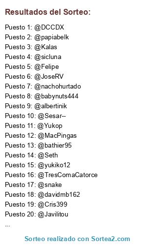 Lista de participantes: @adriy51, @albertinik(105 participaciones), @Amaru(13 participaciones), @AxlFuy, @babynuts444(77 participaciones), @bathier95(3 participaciones), @cordeiroblanco, @Cris399(3 participaciones), @DaimonSag(4 participaciones), @danign96(2 participaciones), @davidmb162(8 participaciones), @DCCDX(73 participaciones), @DeadKillerV10(3 participaciones), @Felipe(100 participaciones), @GenisDiaz, @GhostAdri(2 participaciones), @Ironhammer(5 participaciones), @ivalice27(7 participaciones), @Javilitou(5 participaciones), @JoseRV(274 participaciones), @juancar, @Kalas(218 participaciones), @LolezRoflmao(27 participaciones), @MacPingas(13 participaciones), @Milay(6 participaciones), @Minadediamantes(5 participaciones), @nachohurtado(39 participaciones), @nintendero(2 participaciones), @papiabelk(55 participaciones), @rikimaru28(2 participaciones), @Ronium, @sauko3000, @Scrumm(8 participaciones), @Sesar--(28 participaciones), @Seth(15 participaciones), @sicluna(21 participaciones), @snake(10 participaciones), @TresComaCatorce(15 participaciones), @Vadermoderrno, @yukiko12, @Yukop(61 participaciones).