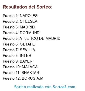 Lista de participantes: MADRID, ATLETICO DE MADRID, INTER, DORMUND, NAPOLES, BAYER, BORUSIA.M, SEVILLA, GETAFE, CHELSEA, MALAGA, SHAKTAR.