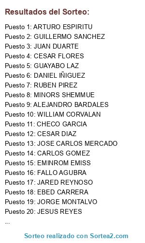 Lista de participantes: ULISES BARRON, JOSE CARLOS MERCADO, DAVID VILLARREAL, CARLOS GOMEZ, ANTONIO ROJAS, MARCELO ACEVES, JAVIER RS, HOMERO TALAMANTES, JUAN DUARTE, LUIS GUTIERREZ, FOBIA CM, JESUS REYES, FALLO AGUBRA, GUILLERMO SANCHEZ, RUBEN PIREZ, EBED CARRERA, ARTURO ESPIRITU, CHECO GARCIA, WILLIAM CORVALAN, HECTOR AVILA, FRANCISCO VALLEJO, ALEJANDRO BARDALES, CARLITOS RDZ, EMINROM EMISS, GUAYABO LAZ, CESAR FLORES, بوجوو غوميس, DANIEL IÑIGUEZ, CESAR DIAZ, JORGE MONTALVO, MINORS SHEMMUE, JARED REYNOSO.