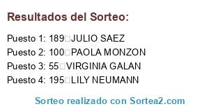 Lista de participantes: 1 ROMINA GONZALEZ GOLD, 2 FABIAN SERAFINI, 3 NILDA FERNANDEZ, 4 JUAN PEDRO AQUINO, 5 MANUEL ROMERO, 6 HUGO CASTRO, 7 RO RODRIGUEZ, 8 ANDREA GALASSI, 9 LILY NEUMANN, 10 LUCIANA CRESTA, 11 YUYI GOMEZ, 12 MONICA OLIVERA, 13 SILVYNA ESCOBAR, 14 MARIANO LUGO, 15 HUGO CASTRO, 16 CHELA GASPAROTI, 17 VANE RODRIGUEZ, 18 LUCIANA CRESTA, 19 JOHA CINAT, 20 MELISA KAUFFMAN, 21 DIEGO VERON, 22 MARIANO LUGO, 23 RO RODRIGUEZ, 24 MARTA SILVA, 25 FATIMA LANGE, 26 YANINA BRITEZ, 27 MARIA N. CARAM, 28 JESSI ZAMUDIO, 29 VERO DELLAGNOLO, 30 VANESA PEON ANGIONI, 31 CUCA CARMONA, 32 PATRI DONDA, 33 JESI POPOVICH, 34 EZEQUIEL GUTIERREZ, 35 NORI FERNANDEZ, 36 SILVIA MORALES, 37 GABRIELA BORELLI, 38 EMA RODRIGUEZ, 39 PATRICIA ACOSTA, 40 NELSON MONACA, 41 ANDRA AGUILAR, 42 RAMIRO HELU, 43 IVAN OBREGON, 44 SOFIA GONZALEZ, 45 ANDREA VECINA VANESA, 46 NOELIA GOMEZ, 47 RAMIRO HELU, 48 MARIA N. CARAM, 49 LEANDRO SANCHEZ, 50 GUILLERMO ORDENAVIA, 52 LUCIANA RAMOS, 53 NOELIA GOMEZ, 54 MARIANA CHAPEDI, 55 VIRGINIA GALAN, 57 EVELYN OBREGON, 58 LUISINA ABET, 59 MELANI NEGRETTI, 60 ERNESTO SOVERON, 61 LISA AMBRELLO, 62 JUAN PEDRO AQUINO, 63 ANGEL, 65 LUCRECIA RACH, 66 SEBA COLOMBO, 67 ALEJANDRO SANDOVAL, 68 GLADYS AMICI, 69 FEDE PANINKA, 70 SILVIA MORALES, 71 RAMIRO CUBILLA, 72 BRIAN GONZALEZ, 73 ERICA ZARACHO, 74 MARIANA CORREA, 75 MARITA VECINA, 76 NELSON MONACA, 77 NIDIA ELENA, 78 ALE LOTERO, 79 ALE LOTERO, 80 ALE LOTERO, 81 ANDREA ZARZA, 82 ALEXIS LANGE, 83 TERESITA PERCIVAL, 84 MARITA VECINA, 85 SOFIA GONZALEZ, 86 GASTON SAEZ, 87 LAURA GOMEZ, 88 FEDE GONZALEZ, 89 MARLEN ESCOBAR, 90 FLORENCIA RADICI, 91 NORI FERNANDEZ, 92 IVANA LEDESMA, 93 MARI ESTRADA, 94 GRACIELA VERA, 95 NELY AROCHA, 96 HUGO CASTRO, 98 ALEXIS LANGE, 99 DIEGO VERON, 100 PAOLA MONZON, 101 GUILLERMO ORDENAVIA, 102 PATRICIA FRANK, 103 LORE BARBONA, 104 RUBIA, 105 HERNAN RAMIREZ, 106 ERNESTO SOVERON, 107 FLOR AQUINO, 108 BELEN RODRIGUEZ, 109 LETICIA AMICI, 110 RAMIRO CUBILLA, 111 LIA BERNACH, 112 VICTORIA FERNANDEZ, 113 MIRIAM ESCALANTE, 114 ESTEBAN RAMIREZ, 115 ANDREA GALASSI, 116 MARIANO LUGO, 117 ANGEL, 118 BRUNO SANTILLAN, 119 JOHA CINAT, 120 MAITEN FERNANDEZ, 121 MARINA CARDOZO, 122 GRACIELA VERA, 123 ELSA PEREZ, 125 SHU WEI, 126 ROMI GOMEZ, 127 SILVI BARRIOS, 128 VERONICA LUNA, 129 NATALIA OCAMPO, 130 FABI SAUCEDO, 131 SANTIAGO ABET, 132 MARIANO LUGO, 133 CUCA CARMONA, 134 CACHO INFELD, 135 SILVIA SUSANA, 136 NATALIA ROMERO, 137 NANCY MEZA, 138 LORE BARBONA, 139 VICTORIA LEHMAN, 140 MAITEN FERNANDEZ, 141 BEATRIZ GONZALEZ, 142 DANIELA SOLIS, 143 ALE PEDRAZZA, 144 NELY AROCHA, 145 RODRIGO DAPOSO, 146 ALEJANDRO GAUNA, 147 ALEJANDRO GAUNA, 148 ISABEL SOTO, 149 ELSA PEREZ, 150 GREIS ARIAS, 151 FRANCA TORTAROLLO, 152 GLADYS AMICI, 153 BELEN RODRIGUEZ, 154 NATALIA ALEGRE, 155 NELIDA GONZALEZ, 156 MARIA ANGELICA CASCO, 157 ROMINA CARMONA, 158 RAMIRO HELU, 159 SILVIA FERNANDEZ, 160 MAURO CARMONA, 161 VERONICA LUNA, 162 LILIA ANGELICA FLORENTIN, 163 MARIANO LUGO, 164 MERCEDES SANDOVAL, 165 LILIANA MABEL BECHER, 166 MARI ESTRADA, 167 JULIANA ANGELO, 168 GUILLERMINA DOMINGEZ, 169 CLAUDIA CARINA PINTO, 170 LETICIA AMICI, 171 BONIFACIA SOTO, 172 IVAN OBREGON, 173 NOELIA BISSON, 174 MIRTA GOMEZ, 175 VICTORIA FERNANDEZ, 176 GABY DESCAMPS, 177 JOHA CINAT, 178 BELEN RODRIGUEZ, 179 LIA BERNACH, 180 ALE WAPPLER, 181 RUBEN VALENZUELA, 182 FABIAN SERAFINI, 183 MERCEDES SANDOVAL, 184 IGNACIO MOHANDO, 185 MARILU SOLER, 186 ANGEL, 187 NATALIA ROMERO, 188 NILDA FERNANDEZ, 189 JULIO SAEZ, 190 ROMINA CARMONA, 191 SOFIA BARICHEVAL, 192 PATRICIA FRANK, 193 JULIO SAEZ, 194 ALICIA CECOTTO, 195 LILY NEUMANN, 196 FRANCA TORTAROLLO, 197 MAURO CARMONA, 198 VIRIGINIA SAUCEDO, 199 DAYANA ARIAS, 200 DORITA GORASTEGUI.