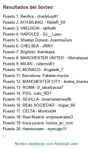 Lista de participantes: CHELSEA - JRIKY, MANCHESTER CITY - kratos_linares, CELTA - Montixx94, SPARTK DE MOSCU- aemepoam, NAPOLES - DJ__Luian, MANCHESTER UNITED - Ultimatejuanma, ATH.BILBAO - NisteR_69, MILAN - rubenss81, MALAGA- topotencia, BORUSSIA DORTMUND- Calvotainas, ATLETICO DE MADRID- LUISKAYAZA, PSG- Julio_RD7, VAELNCIA - lalillo46, ROMA- D_labarbacoa7, ARSENAL - sefis_10, Benfica - charlyboy81, REAL SOCIEDAD - migue_86, Brighton- Kamikaze, Heerenveen - reymago11, Oporto- Ceutito, boca juniors- honda_ipr_civic, SEVILLA- Jimenystelrooy85, Barcelona- Fabiete-murcia, Inter- Miguel_Fdez_97, Shaktar Donest- JuanmaZero, Real Madrid- empresariales3, MONACO- Angelete_7, Liverpool- malagueo.