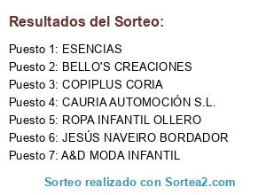 Lista de participantes: A&D MODA INFANTIL, BELLO'S CREACIONES, CAURIA AUTOMOCIÓN S.L., COPIPLUS CORIA, ESENCIAS, JESÚS NAVEIRO BORDADOR, ROPA INFANTIL OLLERO.