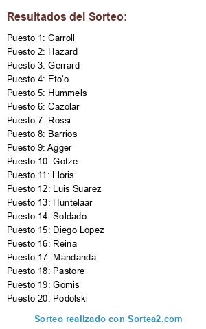 Lista de participantes: Pastore, Gotze, Barrios, Podolski, Huntelaar, Cazolar, Diego Lopez, Hummels, Rossi, Soldado, Mandanda, Lloris, Hazard, Gomis, Luis Suarez, Reina, Gerrard, Eto'o, Carroll, Agger.