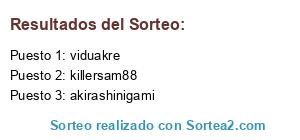 Lista de participantes: patabufete, seterissa, viduakre, nicokaze95, gillmanpowa, galitooos, coffi_milk, 28victor_tgb, d_dunn_13, elgranyipi_, stormseeker79, ixartz, salgadogg, tetsu_sensei, zouterx, madgoatprime, ragnace, killersam88, memo11019, talontrent, seiyavolta, zipnaf, evil_alana, hoplita, styme22, mrdarandan, masacrewilson, shindanar, rapachin, chucky2387, capitancthulhu, litogarciar, saizo88, klight15, imandra, rhonnoa, akirashinigami, nanunemiku, pichonshot, narehop, santi2194, freyane, kanadeiilgames, erken88, 65marc, unnamed_freak, sweethate90, riumou, jappygrizz, zalkker, lgndario, naizard, naniexe, z0rkwa, balaramff, johannayaya, guachitango, jesuflash, zipitron, benja_m9, chiieki, shirosinclair, broka_alive, joshfury25, espsheppan, e5996(4), kimikimies, atennes17, blurheim, the_vikingo, themurlocslayer, abaziel, ken_aku, alemba, tufasrizard, ninnax, rognerius, jakemell, tomasomenos, maxechidnabat, chloeredfield_, barbatosking, alberto_warrior_, windsdeath, nalhwe, alpargatasquad, advectionstride, ismajudoka(2), supraignem, rayandeath, katytavizon, arkhanoid, master_stroke, babirehoz, delosar, elreytemplario, torraco, desdealmeria26, mytictv, gerhard_hs, harukiiiiii, jafet_hotspour, nane_gg(5), khalendrya, xbavic, eoloh, oscarbtome, druibabi, moncandre, hiimmidnight.