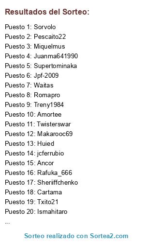Lista de participantes: Txito21, Ancor, Miquelmus, Jorgelm7, Pescaito22, Cartama, Huied, Bubo_79, Twisterswar, Valle__17, Sorvolo, Sheriiffchenko, Supertominaka, Mimiaguero, Amortee, Waitas, Romapro, Ismahitaro, Treny1984, Makarooc69, Levanteedi1, Cortex_xx, Luis22, Rafuka_666, Roqueluis, Jpf-2009, jcferrubio, Juanma641990.