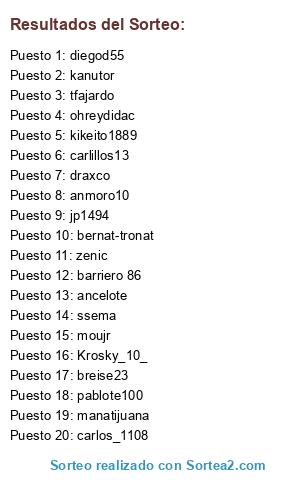 Lista de participantes: kanutor, jp1494, ssema, carlillos13, anmoro10, draxco, breise23, diegod55, carlos_1108, pablote100, manatijuana, Krosky_10_, kikeito1889, ancelote, bernat-tronat, tfajardo, ohreydidac, moujr, zenic, barriero 86.