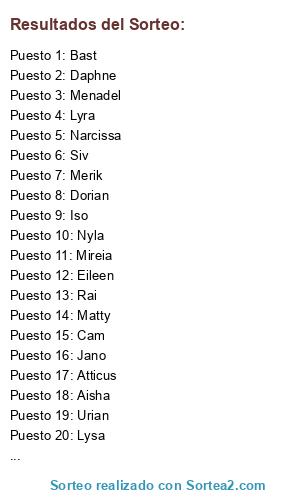 Lista de participantes: Siv, Nyla, Iso, Mireia, Atticus, Dorian, Eileen, Zarek, Bast, Lysa, Aisha, Cam, Daphne, Jano, Jean, Urian, Menadel, Lyra, Merik, Narcissa, Rai, Matty.