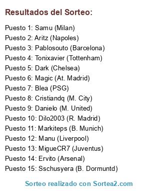Lista de participantes: Samu (Milan), Tonixavier (Tottenham), MigueCR7 (Juventus), Aritz (Napoles), Manu (Liverpool), Sschusyera (B. Dormuntd), Ervito (Arsenal), Cristiandq (M. City), Danielo (M. United), Markiteps (B. Munich), Dilo2003 (R. Madrid), John's (O. Lyon), Blea (PSG), Pablosouto (Barcelona), Dark (Chelsea), Magic (At. Madrid).