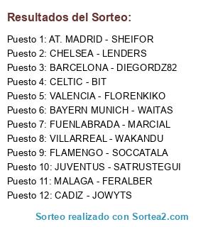 Lista de participantes: VALENCIA - FLORENKIKO, JUVENTUS - SATRUSTEGUI, CHELSEA - LENDERS, AT. MADRID - SHEIFOR, BAYERN MUNICH - WAITAS, MALAGA - FERALBER, CADIZ - JOWYTS, VILLARREAL - WAKANDU, BARCELONA - DIEGORDZ82, FUENLABRADA - MARCIAL, FLAMENGO - SOCCATALA, CELTIC - BIT.