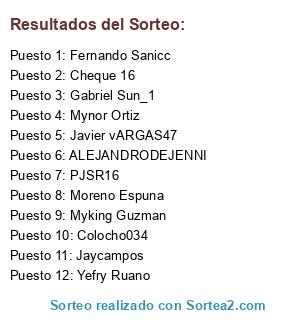 Lista de participantes: Javier vARGAS47, Colocho034, Moreno Espuna, Fernando Sanicc, Yefry Ruano, Jaycampos, PJSR16, Gabriel Sun_1, Myking Guzman, Mynor Ortiz, Cheque 16, ALEJANDRODEJENNI.