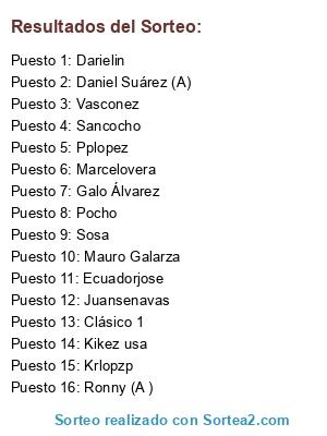 Lista de participantes: Darielin, Vasconez, Ecuadorjose, Pplopez, Mauro Galarza, Kikez usa, Krlopzp, Marcelovera, Clásico 1, Juansenavas, Galo Álvarez, Sosa, Sancocho, Pocho, Daniel Suárez (A), Ronny (A ).