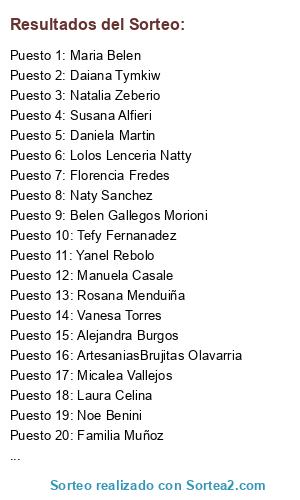 Lista de participantes: Rosana Menduiña, Susana Alfieri, Yanel Rebolo (2 participaciones), Florencia Fredes, Maria Belen, Familia Muñoz, Micalea Vallejos, Natalia Zeberio, Yanina Molina, Alejandra Burgos, Noe Benini, ArtesaniasBrujitas Olavarria, Naty Sanchez, Lolos Lenceria Natty, Tefy Fernanadez, Yohanna Reimondi, Ivana Rodondi, Daniela Martin, Sol Alonso, Sensaciones Aromaticas, Manuela Casale, Vanesa Torres, Daiana Tymkiw, Belen Gallegos Morioni, Ale Cassasa, Giselle Noain, Laura Celina.
