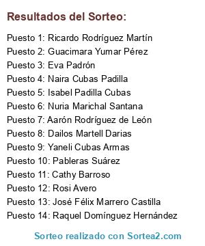 Lista de participantes: Eva Padrón, Isabel Padilla Cubas, Yaneli Cubas Armas, Raquel Domínguez Hernández, Rosi Avero, Ricardo Rodríguez Martín, Guacimara Yumar Pérez, Nuria Marichal Santana, Cathy Barroso, Pableras Suárez, José Félix Marrero Castilla, Aarón Rodríguez de León, Naira Cubas Padilla, Dailos Martell Darias.