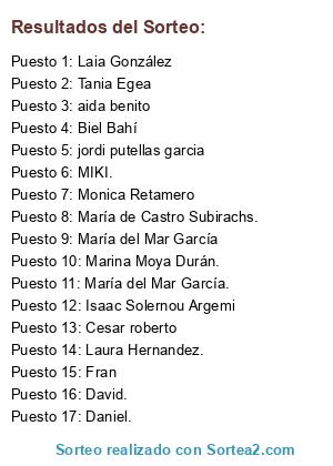 Lista de participantes: Laura Hernandez., María del Mar García., Marina Moya Durán., MIKI., Tania Egea(5 participaciones), Daniel., María de Castro Subirachs., aida benito(4 participaciones), Fran, David., Cesar roberto, María del Mar García, Biel Bahí, jordi putellas garcia, Isaac Solernou Argemi, Monica Retamero, Laia González(98 participaciones).