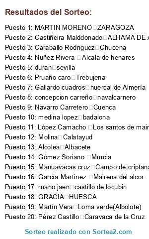 Lista de participantes: Ruiz Montornes del Valles , Rodríguez Quevedo Santa Cruz, muñoz ferrer alberic, serrano san jose de la vega, Esparcia Hellin- Albacete , garcia moreno san clemente, Martínez vilches Parla, urban villamanrique, guardado baeza cullar vega, Rodríguez Madrid , elorza burgos, Guede Aretxabaleta, ramon montalvo palma de mallorca, Climent Tavernes de valldigna, civantos torredelcampo, del Val Madrid, Donaire León Castilleja de la Cuesta, gamez aviles puerto lope , HILARIO CORDERO MEJORADA DEL CAMPO, Ibor Ribes Sueca, Lopez Velez malaga , Mercadal diaz CARTAGENA, Oviedo Jerez, Pamplona González Villanueva de gallego, penalva alicante, Fernández Valencia , Abril garcia Granada, Azuaga infante Malaga, PEREZ MACIAS PATERNA DE RIVERA, alconchel Algeciras , Castiñeira Malddonado ALHAMA DE ALMERÍA, Rubio Martinez Mostoles, garcia algeciras, Martín García Campanillas, Vilchez Ramírez Estepona, Blanco Alcalá de Guadaíra , Huelva Reyes Higuera de la sierra, Chiner Zaragoza, Molina Ubeda, pascual gutierrez segovia, BELLO MIÑO, monge lebrija, García Martínez Mairena del alcor , Pariente Gómez Valladolid , Arnaldos Lopez Altorreal- Molina de Segura, BARRAGAN GONZALEZ LEBRIJA, Ramis Campos, Villaran Cáceres Almonte, Berrocal Florido Pizarra, Perez villanueva Malaga, navarro guillena, Romero Mota del cuervo, Almonacid Camuñas, López Cabrero Sevilla, gomez pozoblanco, RINCON Alcorcon, Correa Morales Tacoronte, Enciso tejedor L arboç, hidalgo rodrigo badajoz, Sanchez Cordoba, GARRIDO ESPIGARES CALLE CASTILLA N 11 ATARFE, Corrales Rivas Vaciamadrid, morales granadilla de abona, Flores Puebla de obando, Molina Calatayud, Pruaño caro Trebujena, Rentero Claros Malaga, Amuedo marchena Algodonales, Perez Sevilla, Marcos Iznalloz, Ruiz Barragán Pilas (Sevilla), Bazán Arévalo, Ruiz Marmolejo, Bernad López Vila-real, Jurado Gallardo Tres Cantos, Cortázar López Carmona , Alcolea Albacete, BELTRAN TAVERNES BLANQUES, cáceres almendralejo, Garcia Lora del rio, Nuñez Rivera Alcala de henares, Peinado del Río Madrid, Rodríguez Zaratán, sánchez carpio CIUDAD RODRIGO SALAMANCA, sanz fernandez peñafiel valladolid, Serrano Gomez Talavera de la Reina , Avecilla marchante Paterna de Rivera (cadiz), Skaloudova Écija ,;Barriada San Pablo 15'' 1D, MOUTA PORTAS, perna marchamalo, Olivan Logroño la rioja , gimeno madrid-parla, Dieste Noia, simal leganes, Arcos Rubi, García Cortés Fuenlabrada, Badenes capsir Villanueva de castellon, VILA CEA VIGO, Lirola Almería, medina lopez badalona, Soto perez Torrejón de la calzada, Urquiza Alhendin, Aguilar Barbate, Perianes Dos Hermanas, moreno cabezo de torres, Moreno Lopez Cabezarados, caceres albolote, abajo moreruela de los infanzones, Atenciano Numancia de la Sagra, Gonzalez Dos hermanas, Navarro montón Zaragoza, Ruiz Jimenez Huetor Tajar, Ordóñez sabinillas,manilva, Guil Terrassa , sanchez sevilla, Hortelano Madrid , Pérez Sevilla, Torresano Madrid, Cardenas castell Lebrija, ALACID ELCHE, Barriga Tinoco Badajoz, martínez moyano fuente palmera, Góemz Madrid, montoya lopez alcaraz, Hernández Romero Totana, benitez benitez chichina de la frontera, Aguado Madrid, Bermejo Moreno Caceres, CARRERA VALDEPEÑAS, perez novo Almuñecar, ruano jaen castillo de locubin, TADEO PALENCIA, gutierrez nieto gijon, ROMERO COGOLLOS VEGA, Ruiz Montoya Marratxi, Antequera Robles Sevilla, Murillo Puebla del Rio, Antolin Pinto, Soriano carreño Torrejón de la calzada, blazquez vitoria-gasteiz, Cañas Tejedera Córdoba, garcia vivancos mazarron, Guerra martinez Petrer, miron naranjo paiporta, PORTILLO BARCELONA, Antequera cheles, arroyo galvez Churriana, Masero Sánchez Valle de Santa Ana, RUIZ MUÑOZ SANGONERA LA SECA , diaz hernandez cartagena, Ferrandez Alboraya, Martinez Javali Nuevo, varea torrent, Butron Ruiz Chiclana , GARCIA NOGUEROL ALMODOVAR DEL RIO , Navarro Carretero Cuenca, Hernandez Alcantarilla, Huecas Magan , Gomez Buesa Bilbao, Blanco Vidal Lliçà d'amunt, rodriguez muskiz, Gómez Navalmoral de la mata, fernandez fernandez, Rosell Fraga, González menayo Terrassa, Carmona López Alcorcon , DIEGUEZ GALLEGO ALLARIZ, perez cedillo del condado( toledo), Márquez Romero La Puebla de Cazalla, lahmidi murcia, Santillan caicedo Valencia , Harko-Boothroyd Madrid, Fernandez Valencia, SALAS ALCORA, Agustín Sanchez muskiz, BAVASTRO ALIAGA ALLARIZ, Cerdán Córdoba Aspe, Fernandez Torres de la alameda, García Barañáin, gocentaite logroño, gomez garcia ecija, Gonzalez Coslada, Herrera Gil Huelva, Martin Alcorcón , Núñez González Seseña, Palomo santos Parla, Pedriza CARBONERO EL MAYOR, RUZAFA SANGONERA LA VERDE, sanchez gonzales ubeda, Cabeza Montequinto, López Navarro Santa Cruz de la zarza Toledo, perez alcala de henares, González Martínez Vigo, Rios Botines Cerdanyola del Valles, Roldan garcía Las gabias , Pavón Solís San Juan de Aznalfarache, relinque giraldo cartagena murcia, González Móstoles, Tortosa Espinardo, Cabas Gómez Madrid , diaz badajoz, Díaz Mariscal badajoz, Muñoz Huerta Las Mesas, Callau Tortosa, Aquino san juan del puerto, Devesa Alcoi, Saez Rodríguez Cartagena, Vidal España Villanueva del ariscal, Descals L Alcudia, Avendaño Alicante, baena rama torredelcampo, perez osuna, Gianre Couce Ferrol, Benitez Benitez Chiclana de la frontera , Garrido Jamilena, Egidos Murcia, Martínez Iznatoraf, duran sevilla, Gómez Gómez ABARÁN, carrasco sevill, mas Sáez elche, Botella Manresa Novelda, martinez Cabrera la unión, Toledo garcía , ALONSO MORALEJA DE ENMEDIO, Montarroso Diaz Madrid, Redondo Villafranca de los caballeros, Delgado Pérez Puente Genil , Amor Lopez lorca, Carrillo Cantero Sabadell, Escalante Carrasco Teba, Espada Quer, Lopez Gonzalez jaen, LORENZO GARCIA FORMENTERA DEL SEGURA, Rodriguez ferrer La vall de uixo, Marín Rocamora Caravaca de la Cruz , perez vargas benacazon, Amaro Zamora , arroyo ferre villanueva del rio y minas, lirio madrid, Miranda Mondaca Sevilla, moreno garcia malaga, Payer