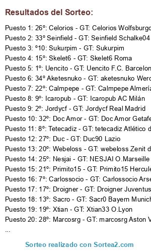 Lista de participantes: 1º: Uencito - GT: Uencito F.C. Barcelona, º10: Sukurpim - GT: Sukurpim, 12º: y0k1 - GT: y0k1 Liverpool, 13º: Sacro - GT: Sacr0 Bayern Munich, 14º: Carkill - GT: Carkill Tottenham, 15º: Skelet6 - GT: Skelet6 Roma, 16º: KloN - GT: Csklonn Sevilla, 17º: Droigner - GT: Droigner Juventus, 18º: Spirky360 - GT: Spirky360 Valencia, 19º: Xtian - GT: Xtian33 O.Lyon, 20º: Webeloss - GT: webeloss Zenit de San Petersburgo, 2º: Jordycf - GT: Jordycf Real Madrid, 21º: Primito15 - GT: Primito15 Hercules, 22º: Calmpepe - GT: Calmpepe Almería, 23º: Bart026 - GT: Badget Oporto, 24º: Rakaldas - GT: Rakaldas Villareal, 25º: Nesjai - GT: NESJAI O.Marseille, 26º: Celorios - GT: Celorios Wolfsburgo, 27º: Duc - GT: Duc90 Lazio, 28º: Marcosrg - GT: marcosrg Aston Villa, 30º: EVL JJcrack10 - GT: EVL JJcrack10, 31º: Gabito09 - GT: gabito09 B.Leverkusen, 3º: Jumi Mario - GT: Jumi Mario Chelsea, 32º: Doc Amor - GT: Doc Amor Getafe, 33º Seinfield - GT: Seinfield Schalke04, 34º Aketesnuko - GT: aketesnuko Werder, 4º: Ayo83xbox - GT: Ayo83xbox, 5º: Ace - GT: AceVX Inter, 6º: CarBel - GT: CarBel80 Manchester, 7º: Carlossocio - GT: Carlossocio Arsenal, 8º: Tetecadiz - GT: tetecadiz Atlético de, 9º: Icaropub - GT: Icaropub AC Milán.