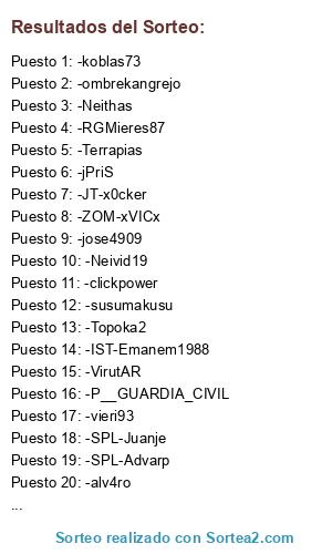 Lista de participantes: -koblas73, -susumakusu, -SrMasto113, -SPL-Juanje, -AnDy_CCF, -Topoka2, -Neithas, -Gofio_Gomero, -vimavillo, -kaylon99, -JSBM, -vieri93, -Terrapias, -IST-Emanem1988, -ZOM-xVICx, -pons55, -SPL-Sánchez, -iagoming, -RGMieres87, -P__GUARDIA_CIVIL, -SPL-Sezar9, -SupDev, -JT-x0cker, -clickpower, -alv4ro, -JT-Suici, -PozoSGL, -SPL-Advarp, -ombrekangrejo, -jose4909, -FiFa_De_GEA1, -Neivid19, -VirutAR, -Danielgr11, -jPriS.