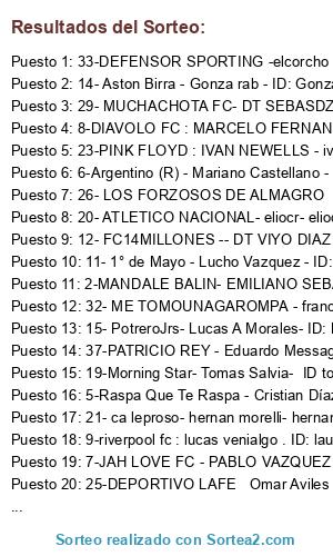 Lista de participantes: 1-BIEN TRANKI FC- MATIAS SOSA- ID: BIENTRANQUIFC, 2-MANDALE BALIN- EMILIANO SEBASTIAN- ID EMOBOCA, 3-LOSGALACTICOS21-FEDE BELTRANDO-ID: LOSGALACTICOS21, 4-Centro Juventud Antoniana. - Pablo Luciano -ID:pablo_CJA, 5-Raspa Que Te Raspa - Cristian Díaz - ID: AguiluchoComRiv, 6-Argentino (R) - Mariano Castellano - ID: Argentino de Rosario, 7-JAH LOVE FC - PABLO VAZQUEZ - ID: JAH_LOVE_FC, 8-DIAVOLO FC : MARCELO FERNANDEZ- ID: marcelo_98-01, 9-riverpool fc : lucas venialgo . ID: lautaro09, 10-DEPUTAS F.C: LEONARDO FRANCISCO BONATTI ID: LEOARGENTOMDQ, 11- 1° de Mayo - Lucho Vazquez - ID: Primero_de_Mayo, 12- FC14MILLONES -- DT VIYO DIAZ --- ID:FC14MILLONES, 13- GUERAIKEFC- EZEQUIEL FERRO- ID: GUERAIKEFC, 14- Aston Birra - Gonza rab - ID: Gonzarab, 15- PotreroJrs- Lucas A Morales- ID: PotreroJrs, 16-Ñubelito- Joel Blanco (loco-bielsa en foro)- ID: NIUBELITO, 17-Desamparados de haedo - Ezequiel Dominguez - id desamparadosfc, 18-ARAGUA FC Santiago Fernandez ID santo__77, 19-Morning Star- Tomas Salvia- ID tomasmorning, 20- ATLETICO NACIONAL- eliocr- eliocabj, 21- ca leproso- hernan morelli- hernan1973-, 22- Real Albañil-Dt Robert Nesta (VascoHaedo)- ID en tramite, 23-PINK FLOYD : IVAN NEWELLS - ivanovik_10, 24- FUTURO FC: Ansony Palomino Fuentes ID: palo30mino-, 25-DEPORTIVO LAFE Omar Aviles ID: deportivolafe, 26- LOS FORZOSOS DE ALMAGRO FACE: GABRIEL MANZO ID: LOS_FORZOSOS_D_A, 27-MATADOR DT: Diego Herrera ID: DIEGOTIGRE-PCA, 28- KRATOS FC : TREZEGUET32 ID VAMOSROJO2012, 29- MUCHACHOTA FC- DT SEBASDZIE ID SEBASDZIE, 30-Roman Lennon- Sergio Pereira- ID CA-ROMAN-LENNON, 31- NATALIA NATALIA -CLAUDIO COCA- AYRJAZ, 32- ME TOMOUNAGAROMPA - franco mojica- franco_canob74, 33-DEFENSOR SPORTING -elcorcho, 34- Vende humo Daniel Altamirano id vende--humo, 35- MARICONCHITAS - Pablo Soza - MAR-ICONCHITAS, 36-C.A.TURU TURU1011, 37-PATRICIO REY - Eduardo Messagli - ID: Messagli.