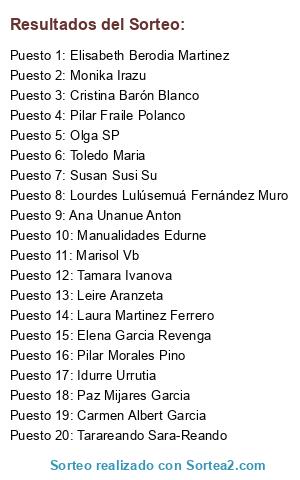 Lista de participantes: Olga SP, Marina Nina, Gema GC, Carmen Albert Garcia, Ana Unanue Anton, Tamara Ivanova, Pilar Morales Pino, Monika Irazu, Manualidades Edurne, Genoveva Gomez Garcia, Pilar Fraile Polanco, Carmen Gutierrez Ramos, Cristina A.P., Leire Aranzeta, Toledo Maria, Marisol Vb, Pili Berro, Susan Susi Su, Anita Rodri, Idurre Urrutia, Ines Corrales, Lourdes Lulúsemuá Fernández Muro, Lucia Nieves Gallego, Elisabeth Berodia Martinez, Paz Mijares Garcia, Laura Martinez Ferrero, Carolina Lopez, Elena Garcia Revenga, Loli Mateo Zambrana, Cristina Barón Blanco, Tarareando Sara-Reando, Dina Pepi Sorginetxea.