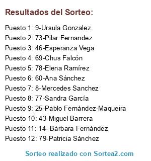 Lista de participantes: 1-María Teresa, 4-M carmen fernandez, 8-Mercedes Sanchez, 9-Ursula Gonzalez, 10-Yolanda Vegas, 12-Mario Sanchez, 14- Bárbara Fernández, 15- Laura Miño, 17- David Sanchez, 22-Teresa García, 23-Bertha Soriano, 25-Pablo Fernández-Maqueira, 30-Elena, 34-Maria Lopez, 38- isabel Simon, 43-Miguel Barrera, 44-Eva Garcia, 45-Ziortza Guerricagoitia, 46-Esperanza Vega, 50-Isabel Alba, 56-Malena Rescia, 60-Ana Sánchez, 62-Carolina Martínez, 63-Víctor Gómez, 66-Nazaret Bueno, 69-Chus Falcón, 73-Pilar Fernandez, 75-Paloma Céspeces, 77-Sandra García, 78-Elena Ramírez, 79-Patricia Sánchez, 81-Elena Muñoz, 82-María Jurado.