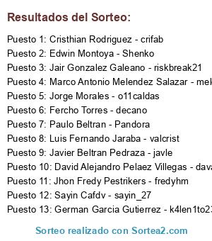 Lista de participantes: Jair Gonzalez Galeano - riskbreak21, Marco Antonio Melendez Salazar - melendez_marco, Fercho Torres - decano, Jorge Morales - o11caldas, Sayin Cafdv - sayin_27, Jhon Fredy Pestrikers - fredyhm, German Garcia Gutierrez - k4len1to23, Luis Fernando Jaraba - valcrist, Cristhian Rodriguez - crifab, David Alejandro Pelaez Villegas - davalty, Javier Beltran Pedraza - javle, Paulo Beltran - Pandora, Edwin Montoya - Shenko.