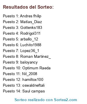 Lista de participantes: Andres fhilip, Saul campas, oswaldneftali, baloyancy, hamiltox100, Roman Martinez_, Nil_2008, Optimum Raeda, Rodrigol311, Matías_Diaz, Luchito1988, Lopez36_1, arballo_12, Gottenks183.
