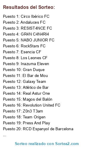 Lista de participantes: Inazuma Eleven, Magos del Balón, PureFootball, Revolution United FC, Bodka Juniors, Andaluces FC, RESIST4NCE FC, GR4N C4N4RI4, NABO JUNIOR FC, Los Leones CF, Classic Rookies, RCD Espanyol de Barcelona, Atlético de Bar, Esencia CF, Circo Ibérico FC, Gran Duque, RockStars FC, El Bar de Mou, Z0n3 T3am, FIFA Apocalypse, Green Team, Team Origen, Canarinha CF, Soccer City, Galaxy Team, Press And Play, UD Puro Fútbol, Real Astur One, Sheriton FC.