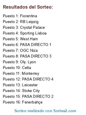 Lista de participantes: Oly. Lyon, RB Leipzig, Stoke City, Leicester, Celta, West Ham, Crystal Palace, Fiorentina, Sporting Lisboa, Monterrey, OGC Niza, Fenerbahçe, PASA DIRECTO 1, PASA DIRECTO 2, PASA DIRECTO 3, PASA DIRECTO 4.