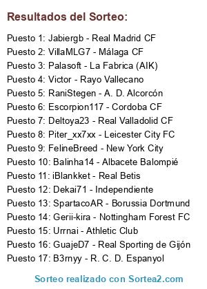 Lista de participantes: Deltoya23 - Real Valladolid CF, Piter_xx7xx - Leicester City FC, FelineBreed - New York City, Escorpion117 - Cordoba CF, Victor - Rayo Vallecano, iBlankket - Real Betis, VillaMLG7 - Málaga CF, Urrnai - Athletic Club, SpartacoAR - Borussia Dortmund, GuajeD7 - Real Sporting de Gijón, Balinha14 - Albacete Balompié, Jabiergb - Real Madrid CF, B3rnyy - R. C. D. Espanyol, Dekai71 - Independiente, Gerii-kira - Nottingham Forest FC, RaniStegen - A. D. Alcorcón, Palasoft - La Fabrica (AIK).
