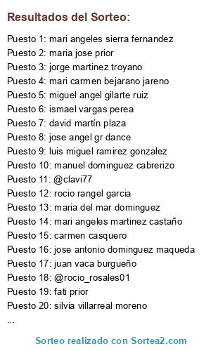 Lista de participantes: carmen casquero, @clavi77, david martín plaza, enrique aceituno marchena, fati prior, ismael vargas perea, jorge martinez troyano, jose angel gr dance, jose antonio dominguez maqueda, juan vaca burgueño, luis miguel ramirez gonzalez, manuel dominguez cabrerizo, maria del mar dominguez, maria jose prior, mari angeles martinez castaño, mari angeles sierra fernandez, mari carmen bejarano jareno, miguel angel gilarte ruiz, nuri rangel caballero, rocio navarro, rocio rangel garcia, @rocio_rosales01, silvia villarreal moreno.
