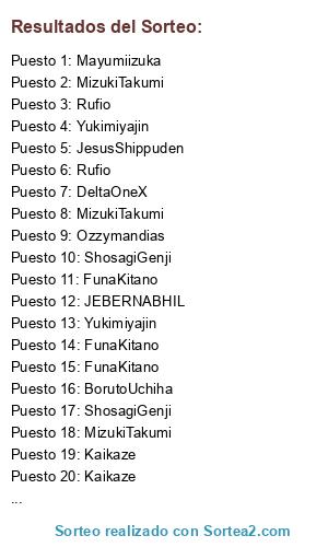 Lista de participantes: xDelosReyesOne7x (7), FunaKitano (8), Duple (2), DeltaOneX (9), JEBERNABHIL (4), Rufio (4), Juanjete1515 (1), MizukiTakumi (7), AjmsVnzla (1), KairiMizukami (3), BorutoUchiha (3), Yukimiyajin (5), ShosagiGenji (5), GenmaYagyuu (5), Azico (5), Mayumiizuka (4), Magu (4), Kaikaze (4), Ozzymandias (5), JesusShippuden (4).