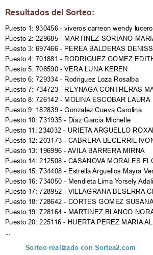 Lista de participantes: 682800 - TUZ GOMEZ IVONNE DEL CARMEN, 698002 - PANTÍ MORALES BEATROZ ADRIANA, 688679 - URDIANO CORONA YADIRA, 697093 - CRUZ ASCENCIO DIANA LAURA, 694705 - GARCIA CUEVAS EDITH, 698053 - VEGA MORALES MARIA DEL PILAR, 702592 - ROSAS GUERRERO FERNANDO, 709286 - CARDEÑA AGUILERA NIMBE, 686765 - ORTIZ CASTRO GUADALUPE, 701881 - RODRIGUEZ GOMEZ EDITH, 707535 - MANDUJANO SOLIS ERIKA, 703747 - FRIAS CRUZ DULCE JAZMIN, 689499 - Acosta Acevedo Cesar Octavio, 167294 - CONTRERAS BARRERA GISEL, 180544 - AGUILAR MONTEON MELINA, 182335 - VILLAGOMEZ MORENO MIRIAM, 182839 - Gonzalez Cueva Carolina, 214015 - RUIZ HERNANDEZ RAMONA LILI, 219934 - ESCALANTE CANCHE SONIA DEL CARMEN, 203671 - NIETO ESQUIVEL MARTHA PATRICIA, 225691 - ALVAREZ ALVAREZ SILVIA, 231562 - DE LA CRUZ DE LA CRUZ ARACELI, 245500 - PITA DUQUE ELIAZAR, 247573 - URTEAGA gonzalez CARMINA, 693930 - GALVAN ZARAZUA ALMA, 255375 - DURAN CARCAMO CELINA, 693810 - SILVA BLANCAS ROGELIA DEL CARMEN, 262915 - GONZALEZ MAR ALMA LETICIA, 262899 - CONCHILLOS CONSTANTINO JOSEFINA, 304688 - CHAVEZ NAVARRO MARIA GUADALUPE, 714929 - CANUL CEJAS ANABEL, 722524 - Hernandez GUTIERREZ Erika, 725100 - HERMIRA ARENA NADIA DEL CARMEN, 724301 - ITUARTE CAMACHO LAURA GEORGINA, 733110 - MORENO ORTIZ MA. ISABEL, 733703 - ROSADO ROCHER PATRICIA GUADALUPE, 732780 - VARGAS ROSALES PALOMA GRISSEL, 734621 - Vasquez Moreno Marta, 732133 - Hernández Velázquez Leticia, 728745 - SAAVEDRA GALLEGOS LOIDA ESLI, 186651 - CHAVEZ MARQUEZ ALBERTO, 189283 - LIZARRAGA MONTERO ROSA INES, 212961 - OCHOA CADENAS ANA LILIA, 217764 - VALENCIA ARAUJO IRMA AURORA, 246138 - CANO RODRIGUEZ LAURA FABIOLA, 254885 - galvez colmenares isabel cristina, 305031 - SANCHEZ DE LA ROSA FELIX FERNANDO, 317968 - OSUNA ROJAS CLAUDIA LIZETH, 339433 - aparicio medina lizbeth, 708297 - MALDONADO ERENAS CINTHYA PATRICIA, 707138 - AQUINO MOTA JAANAI, 716687 - Bailon Alejo Berenice, 718185 - JARA MAYA VERONICA, 726877 - HIRAY CARBALLIDO LAURA CECILIA, 725505 - BRAVO TORRES ARTURO, 728932 - PANIAGUA RONQUILLO MONICA ESTEFANIA, 728596 - Garza Cisneros Judith lizett, 728608 - BERNARDINO VASQUEZ YAZMIN LUCERO, 723763 - GAMEZ BOBADILLA MARIA ELENE, 733966 - BELLO DELGADO LETICIA, 731964 - RANGEL VILLASEÑOR OVIDIA, 732284 - MELENDEZ PEREZ MARCELA, 730915 - VILLANUEVA VILLA SYLVIA, 730924 - VELEZ MANZANARES ANA GUADALUPE, 166110 - MORENO MARTINEZ ELIZABETH, 608211 - Rodriguez Romero Araceli, 186425 - NERI SILES SAGRARIO ADRIANA, 207187 - GONZALEZ BARRAGAN ROSELIA, 215238 - SANCHEZ MELLADO ELIZABETH LINA, 244140 - RODRIGUEZ JASSO ARGELIA, 692693 - ALEJANDRO RODRIGUEZ ROGELIO, 705976 - AYALA MENDOZA LUCIA, 705698 - ZARATE CARVAJAL VIRGINIA, 710265 - DAVALOS PACHECO SARA, 711938 - GOMEZ GARCIA MARIA DEL CARMEN, 730786 - VAZQUEZ FERREYRA MARGARITA, 729676 - REYES ALAVEZ ROSA MARIA, 723629 - MARTINEZ MIRANDA MARIA ELENA, 731145 - ANDRADE CASTELLON MARIA ELENA, 733833 - VALTIERRA DIAZ BLANCA CONCEPCIÓN, 734099 - ESCALANTE CASTRO JANETTE, 734101 - GONZALEZ PEREZ GUILLERMINA, 734408 - Estrella Arguellos Mayra Veronica, 930456 - viveros carreon wendy lucero, 685959 - BRAVO GARRIDO IRINA, 229845 - ROBLES ROMERO SUSANA, 239075 - MARTINEZ RODRIGUEZ ZULEYMA, 242790 - ALLENDE VASQUEZ EUGENIA, 246545 - AGUAYO rodriguez MARIA DEL CARMEN, 255246 - CUELLAR MONTESINOS MARIANA, 264219 - GOMEZ ANDRADE MONICA, 262970 - LOPEZ PEGUERO VERONICA, 254353 - TINAJERO ALDERETE MIRIAM, 319387 - SERRANO BAUTISTA ALICIA, 316808 - SALDAÑA CHAVARRIA MA GUADALUPE, 314658 - VELAZQUEZ AREVALO EUNICES, 325433 - PEREZ PEREZ ELVIRA, 330946 - Tapia Canseco Ariadna, 348765 - OLIVOS CONTRERAS MARIA ERIKA, 704918 - MENDOZA MENDOZA VERONICA, 706645 - García Montenegro María Cristina, 708634 - CASTILLO EVANS MAYRA YADIRA, 712663 - DOMINGUEZ JERONIMO FLOR DEL RIO, 714210 - NAVA ESPINOZA LILIANA, 718366 - UGALDE ALCÁNTARA GLORIA MARIBEL, 725146 - ESTRADA PEREGRINO ROSA ISELA, 727144 - Mares Aviles Lodi, 170702 - CALDERON MARIA ELENA, 182954 - CASTILLO OCHOA MAYRA LIZZETH, 190136 - CUESTA ZENTENO CARMEN BEATRIZ, 196297 - GUZMAN NERI MARIA DEL SOCORRO, 195670 - VEGA RAMOS TERESITA DE JESUS, 212508 - CASANOVA MORALES FLORA, 229271 - VENTURA MARTINEZ MARILU, 226744 - CASTRO MARTINEZ MIRYAM ELIZABETH, 226421 - Huerta Alburquerque Elizeth, 691213 - VIRGEN MARES DANIELA GEORGINA, 254299 - GARCIA MORA ANA KARINA, 249394 - SOLORZANO HANON NORMA LILIANA, 285616 - DELGADILLO ORTEGA BLANCA GUADALUPE, 704224 - POZOS ESPINOSA EVELYN DEL CARMEN, 707071 - PERALTA CALDERON ANA KARENINA, 698391 - MENESES GARCIA FIDENCIO, 714097 - Plascencia cruz Zaria, 719100 - PEREZ TRICHER ISABEL CONCEPCION, 717635 - RODRIGUEZ FRANCO KARINA, 717642 - LORENZANA CAMARA LAURA ISABEL, 716755 - GARCIA HERNANDEZ CRUZ GABRIELA, 734538 - GARCIA BACA OLIVA, 733762 - GOMEZ GONZALEZ MARCIA PAULINA, 733763 - BELTRAN BELTRAN GUADALUPE DEL PILAR, 733764 - Morales Navarro Angèlica, 734087 - MENDEZ ESPINOZA ERIKA, 732243 - PEÑA GALLARDO ALEJANDRA FABIOLA, 729078 - HERNANDEZ HERNANDEZ CAROLINA GUADALUPE, 728727 - GUILLEN NEPITA ANA LAURA, 168407 - VELASCO CHAVEZ VICENTE, 683233 - Alfaro Almaraz Ana Magdalena, 683996 - URIBE OCAMPO GUADALUPE, 212056 - CASIAN HERNANDEZ EDUARDO HUMBERTO, 227530 - MORTEO MORALES CLAUDIA CECILIA, 688611 - Escalera Velazquez Maricela, 233443 - alvarado tapia itzel maria, 243181 - ORDAZ COSIO MARIA ENGRACIA, 249225 - Villegas Ramirez Cecilia, 248879 - HERNANDEZ SANCHEZ SELENE, 248563 - CANDELEROS COLLADO EDITH, 253559 - SALAZAR LEYVA MARIA ISABEL, 282416 - VARGAS GONZALEZ ROCIO ALEJANDRA, 294073 - medina lopez Ynes, 308238 - PAZ PEREZ ANABELL, 698331 - MONICO ALVAREZ MA. GUADALUPE, 698286 - SUSARREY CARDOZA OMAR, 703781 - VAZQUEZ REYES ALEJANDRA, 708692 - GASCA LEMUS MARICELA, 711874 - RAMOS GONZALEZ RUTH ALICIA, 715233 - MORALES HERNANDEZ ANAHI, 725337 - ANAYA VIRGEN ALMA LETICIA, 724938 - SANDOVAL BAZAN GEORGINA, 724608 - juarez arellanes eidi magnolia, 724232 - VIGUERAS RAMIREZ PAULA, 733087 - Luna Guillen Alejandra, 733466 - RIVERA HERNANDEZ CLAUDIA NOE