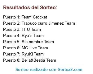 Lista de participantes: Team Crocket, FFU Team, Bella&Bestia Team, Trabuco curro Jimenez Team, RyuKi Team, Sin nombre Team, MC Live Team, Ryu´s Team.
