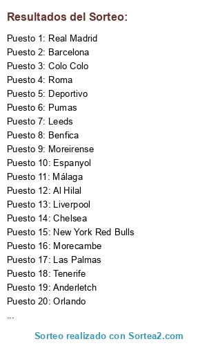 Lista de participantes: Barcelona, Tenerife, Al Hilal, Real Madrid, Stoke City, Roma, Granada, Orlando, Espanyol, Colo Colo, Morecambe, Pumas, Bayern, Chelsea, Deportivo, Manchester City, Las Palmas, Liverpool, Moreirense, Málaga, New York Red Bulls, Benfica, Leeds, Anderletch.