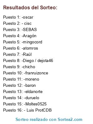 Lista de participantes: -eldanorte, -atomros, -baron, -moreno, -franruizonce, -Raúl, -Moltes0525, -Aragón, -oscar, -SEBAS, - Luis ProtCDB, -Diego / dejota46, - cisc, -chicho, -mingocord, -duruelo.