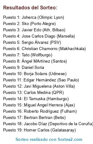 Lista de participantes: Sergio Álvarez (PSV), Jose Carlos Diago (Marsella), Joherca (Olimpic Lyon), Javier Edo (Ath. Bilbao), Miguel Angel Herrera (Ajax), Ángel MArtínez (Santos), Carlos Medina (QPR), Javi Miguelena (Aston Villa), Christian Chamorro (Makhachkala), Roberto Rodríguez (Fulham), Tato (Wolfburgo), Borja Solans (Udinese), Homer Carlos (Galatasaray), Bertran Bertran (Betis), Sko (Porto Alegre), El Tamuska (Hamburgo), Jacobo Díaz (Deportivo de la Coruña), Edgar Hernández (Sao Paulo), Daniel Soria.