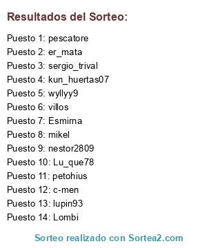 Lista de participantes: sergio_trival, villos, kun_huertas07, er_mata, Lu_que78, petohius, lupin93, Esmirna, Lombi, wyllyy9, pescatore, c-men, mikel, nestor2809.