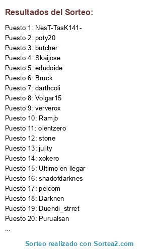 Lista de participantes: xokero, Skaijose, stone, guti, poty20, edudoide, pelcom, olentzero, Bruck, Dalex, Darknen, NesT-TasK141-, ververox, Duendi_strret, shadofdarknes, butcher, Volgar15, julity, Purualsan, darthcoli, chejoperrez, Ramjb, Ultimo en llegar.