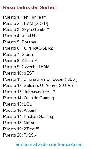 Lista de participantes: Dinosaurios En Boxer ( dEb ), Czzech -TEAM, Ten For Team , Ðreams , Storm, Friction Gaming, T.K.S.-, Na´Vi -, 2Time™, TOPFRAGGERZ , TEAM [S.O.D], Soldiers Of Army ( S.O.A ), SkyLeGends™, Albañil | , LOL, Killers™, bEST, wizaRdz, Jabbawockeez™|, Outside Gaming, THExSHARK.