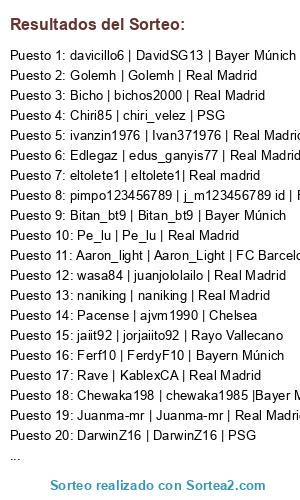Lista de participantes: Rave | KablexCA | Real Madrid, Golemh | Golemh | Real Madrid, Aaron_light | Aaron_Light | FC Barcelona, Chiri85 | chiri_velez | PSG, Steel | the_big_bam | Manchester City, Ferf10 | FerdyF10 | Bayern Múnich, eltolete1 | eltolete1| Real madrid, Akuario | AkuarioPSF | Real Madrid, Pakitokanuto | pakitokanuto | Real Madrid, ivanzin1976 | Ivan371976 | Real Madrid, Punisher529 | Punisher529 | Chelsea, pmartin2 | pedrosfc93 | Atco de Madrid, MiGuelCheca | MiGuelCheca | Manchester City, pimpo123456789 | j_m123456789 id | FC Barcelona, jaiit92 | jorjaiito92 | Rayo Vallecano, wasa84 | juanjololailo | Real Madrid, Juanma-mr | Juanma-mr | Real Madrid, DarwinZ16 | DarwinZ16 | PSG, Pe_lu | Pe_lu | Real Madrid, Danny_BG14 | Danny_BG14 | Borussia Dortmund, Bitan_bt9 | Bitan_bt9 | Bayer Múnich, davicillo6 | DavidSG13 | Bayer Múnich, Pacense | ajvm1990 | Chelsea, Denniscnp | denniscnp | Bayer munich, aythamispain | aythamityler | Chelsea, bobas78 | bobas78 | FC Barcelona, Edlegaz | edus_ganyis77 | Real Madrid, djzazo | djzazo | Real Madrid, Chewaka198 | chewaka1985 |Bayer Múnich, Bicho | bichos2000 | Real Madrid, pelotas7 | bailen7 | FC Barcelona, naniking | naniking | Real Madrid, .