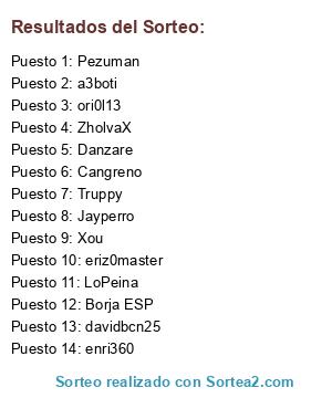 Lista de participantes: ZholvaX, eriz0master, a3boti, davidbcn25, Borja ESP, enri360, Jayperro, ori0l13, LoPeina, Cangreno, Pezuman, Danzare, Xou, Truppy.