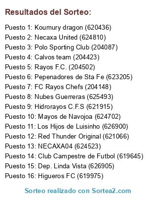 Lista de participantes: Club Campestre de Futbol (619645), Necaxa United (624810), Mayos de Navojoa (624702), Pepenadores de Sta Fe (623205), Higueros FC (619975), Calvos team (204423), Nubes Guerreras (625493), Red Thunder Original (621066), Polo Sporting Club (204087), Los Hijos de Luisinho (626900), Dep. Linda Vista (626905), FC Rayos Chefs (204148), Hidrorayos C.F.S (621915), NECAXA04 (624523), Koumury dragon (620436), Rayos F.C. (204502).