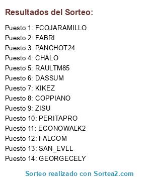 Lista de participantes: KIKEZ, PERITAPRO, SAN_EVLL, COPPIANO, FABRI, GEORGECELY, RAULTM85, PANCHOT24, ZISU, FCOJARAMILLO, CHALO, FALCOM, ECONOWALK2, DASSUM.