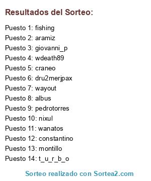 Lista de participantes: wdeath89, nixul, giovanni_p, constantino, t_u_r_b_o, craneo, wanatos, montillo, dru2merjpax, pedrotorres, fishing, wayout, aramiz, albus.